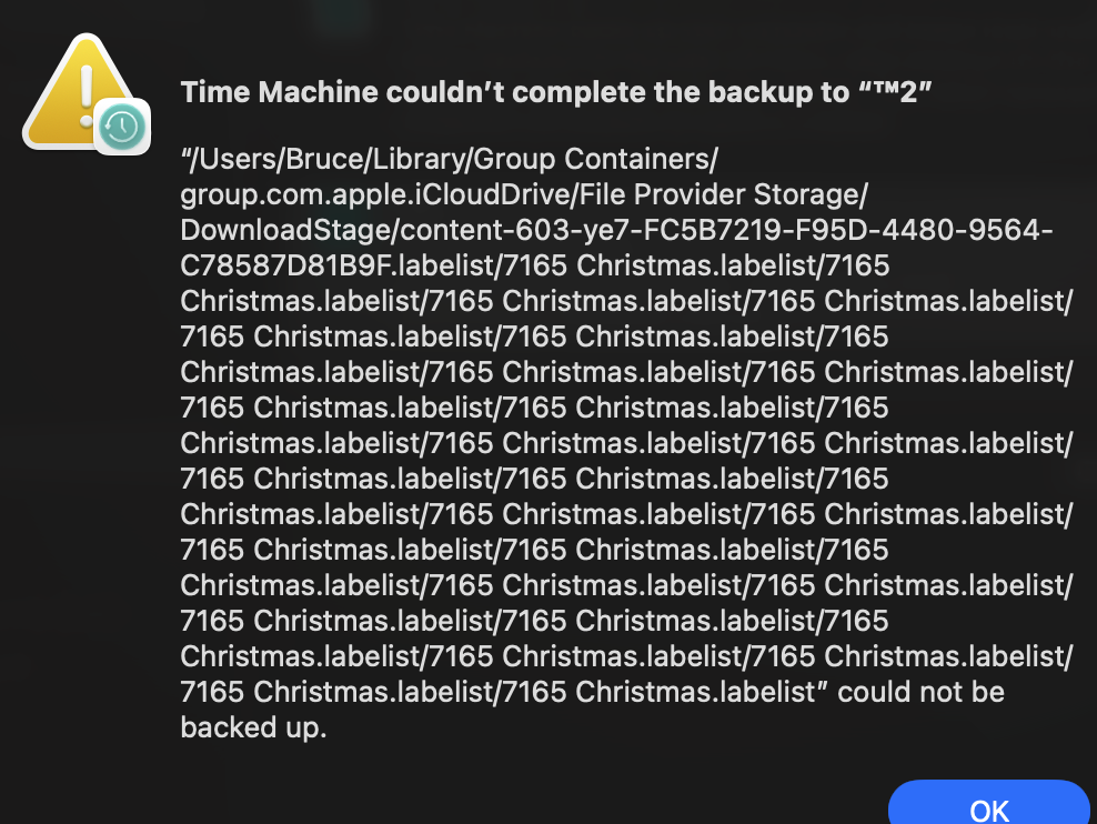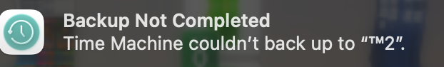 For the last two weeks Time Machine has been unable to complete back up. It's throwing up the following: