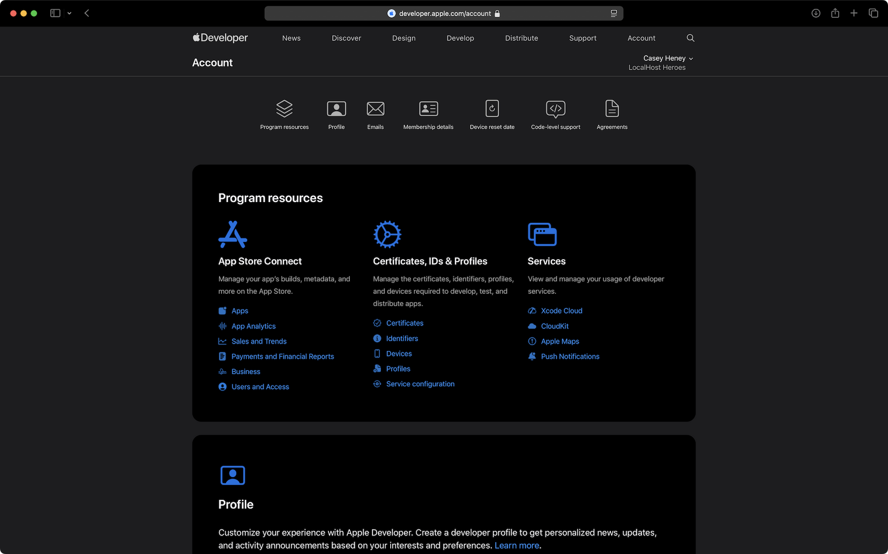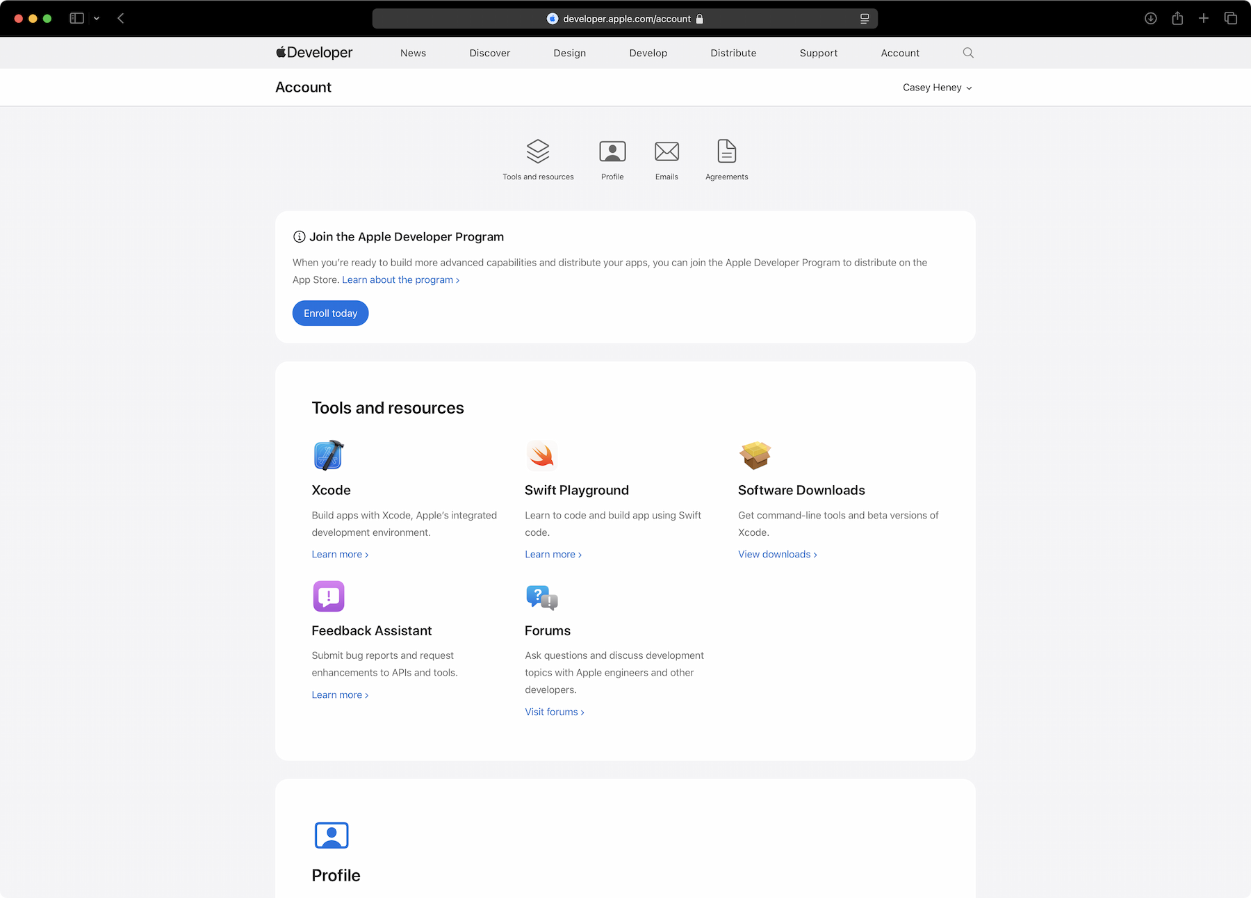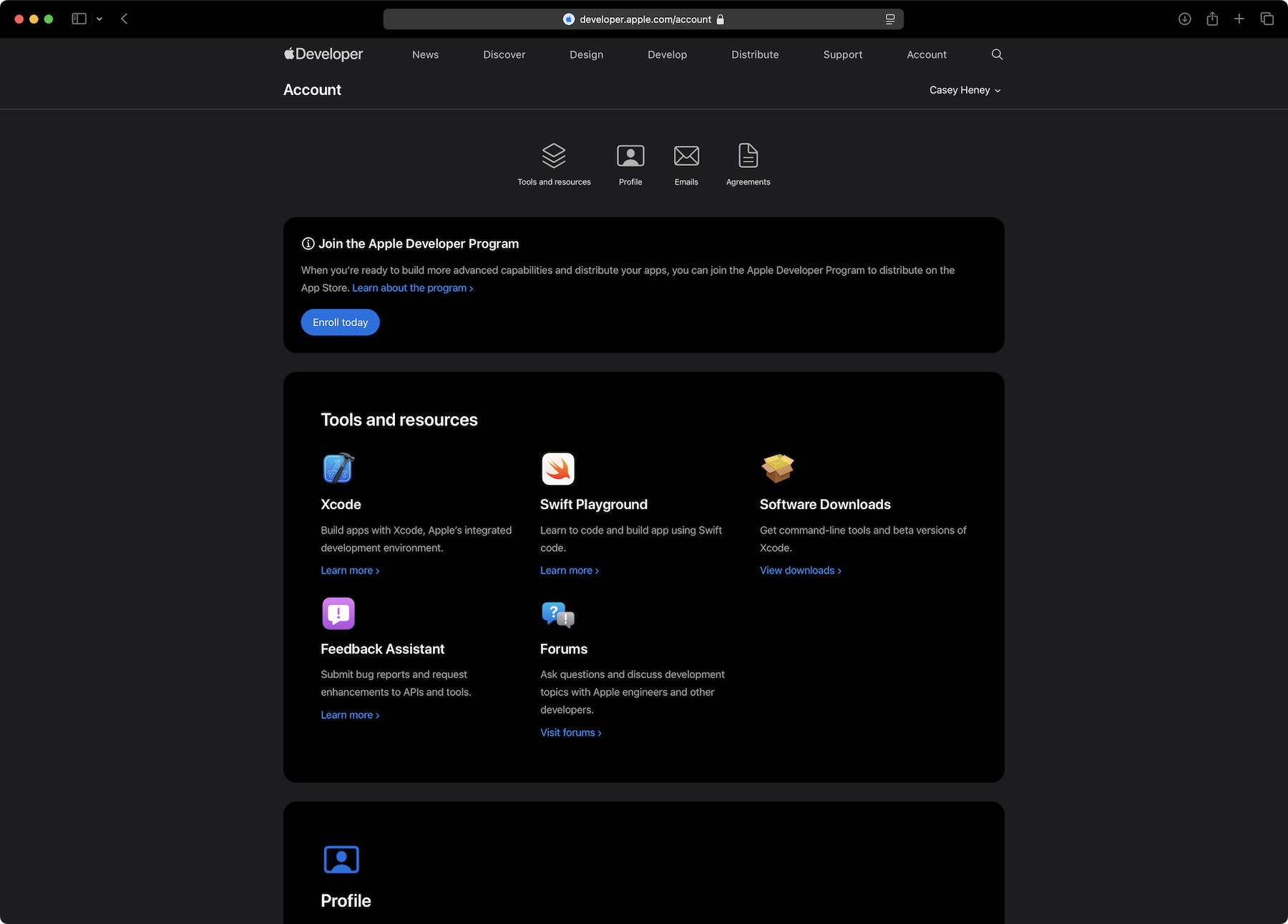 The sections shown in your account depend on whether you’ve registered for free or are enrolled in a paid program (the Apple Developer Program or Apple Developer Enterprise Program). If you’ve been added to a team, the actions you can take in these sections depend on the roles you’ve been assigned.