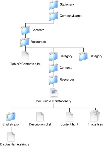 The mail stationery bundles are installed within the category folders, known as category bundles. If the stationery is properly installed, the directory structure should look like Figure 2.