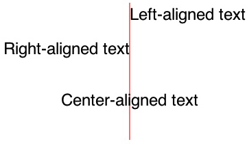 Figure 5-1 shows the different text alignment settings applied to text drawn at the same x-coordinate, shown by the red line.