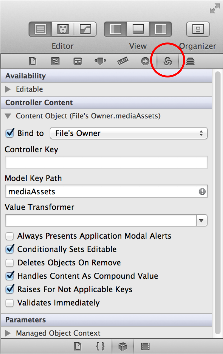 Each view and controller class exposes a set of bindings. You can inspect the bindings of an object using Interface Builder by selecting it and displaying the Bindings pane in the Info window. Select your array controller in the nib file and display its bindings as shown in Figure 4.