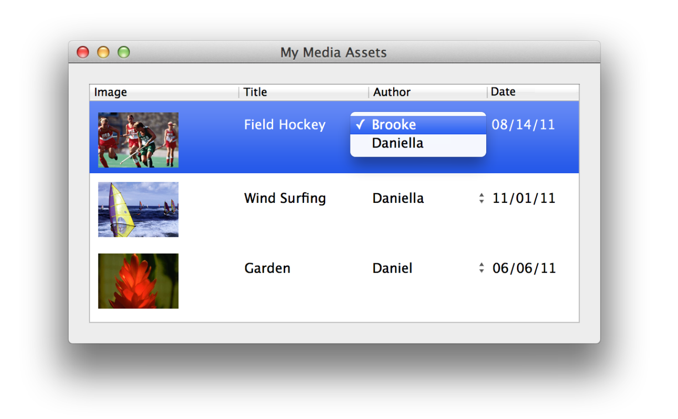 This article extends the example presented in Creating a Master-Detail Interface by adding a pop-up menu to the table view in the master interface. Instead of displaying the author’s last name in the Author column, you might allow users to select an author from a pop-up menu, as shown in Figure 1. Note that if you display just the last name, you have essentially flattened the to-one relationship. Consequently, if the user enters text in an editable Author column text cell, the user changes the value of the last name property belonging to the Person object, not the destination of the to-one relationship belonging to the Media object. Using pop-up menus is one way to implement an editable to-one relationship.