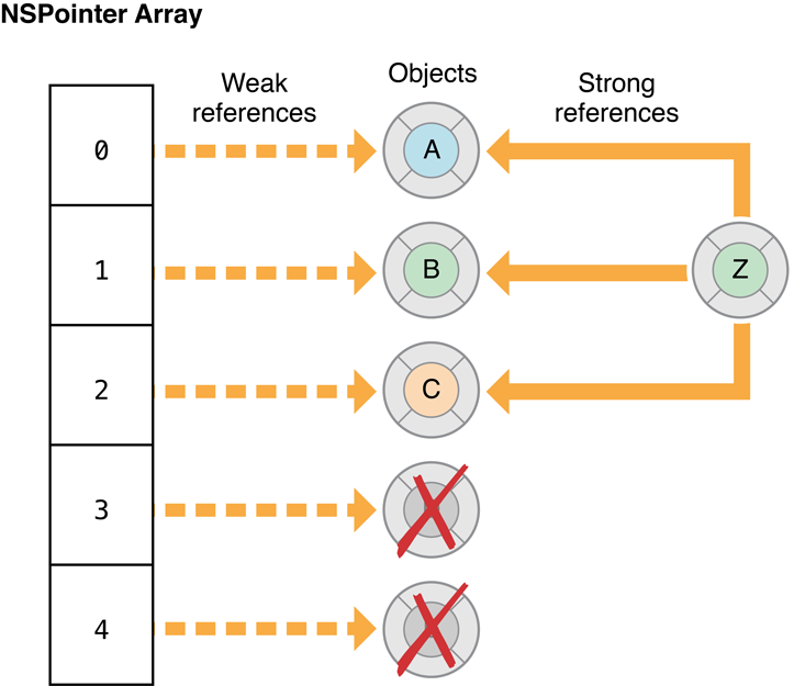 The NSPointerArray class also defines a number of convenience constructors for creating a pointer array with strong or weak references to its contents. For example, pointerArrayWithWeakObjects creates a pointer array that holds weak references to its contents. These convenience constructors should only be used if you are storing objects.