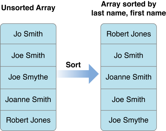 You may need to sort an array based on some criteria. For instance, you may need to place a number of user-created strings into alphabetic order, or you may need to place numbers into increasing or decreasing order. Figure 2 shows an array sorted by last name then first name. Cocoa provides convenient ways to sort the contents of an array, such as sort descriptors, blocks, and selectors.