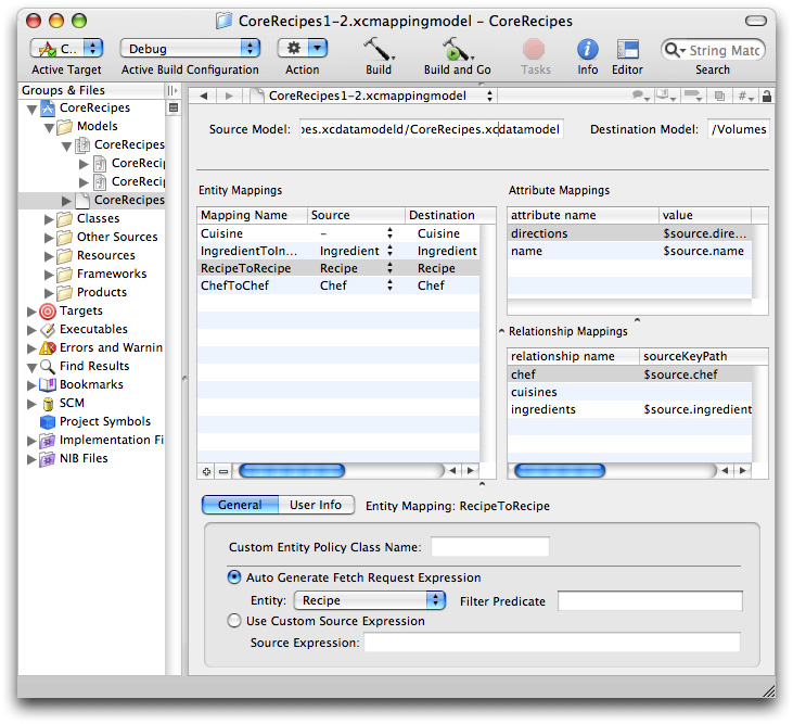 From the File menu, you select New File and in the New File pane select Design > Mapping Model. In the following pane, you select the source and destination models. When you click Finish, Xcode creates a new mapping model that contains as many default mappings as it can deduce from the source and destination. For example, given the model files shown in Figure 1-1 and Figure 1-2, Xcode creates a mapping model as shown in Figure 4-1.
