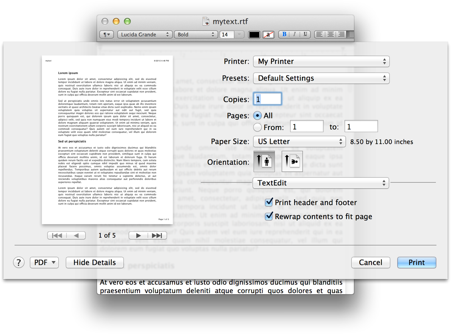 When you run a print operation, your accessory view is available for viewing in the Print panel. Figure 5-2 shows the accessory view for the TextEdit sample code project. Figure 5-1 shows the view as it appears in Interface Builder.