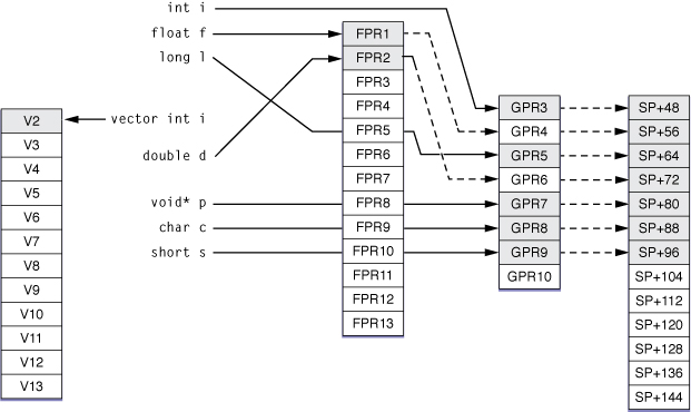| FPR1, GPR4 | First floating-point element, so it goes in the first floating-point register and the next available general-purpose register. |