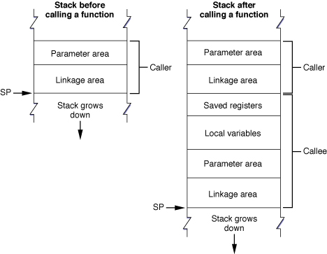 stwu,stwux,stdu, orstdux) so that the stack pointer and back-link are in a consistent state. Otherwise, asynchronous signals or interrupts could corrupt the stack.Saves all nonvolatile general-purpose and floating-point registers into the saved-registers area. Note that if the called function does not change a particular nonvolatile register, it does not save it.