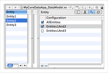 A configuration is a named collection of entities in the model. The configuration pane (show in Figure 10) therefore applies only to entities. You use it to add and remove configurations and to associate entities with configurations. For more about configurations and how to use them, see Managed Object Models.