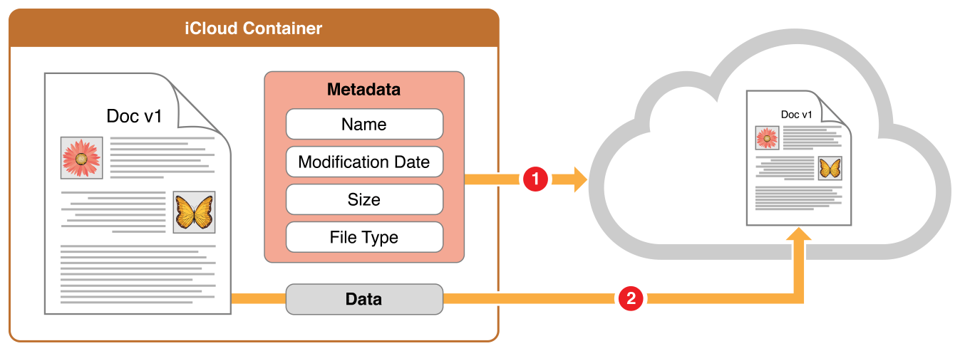 The first time your app adds a document’s on-disk representation to an iCloud (ubiquity) container, the system transfers the entire file or file package to the iCloud server, as shown in Figure 3-2. The first step is to send the document’s metadata, which includes information such as the document name, modification date, file size, and file type. This metadata transfer takes place quickly. The second step is to send the document’s data. Sending the document metadata first lets iCloud know quickly that a new document exists. The iCloud server propagates new and changed metadata quickly to all other available devices attached to the same iCloud account. This lets the devices know that a new document is available.