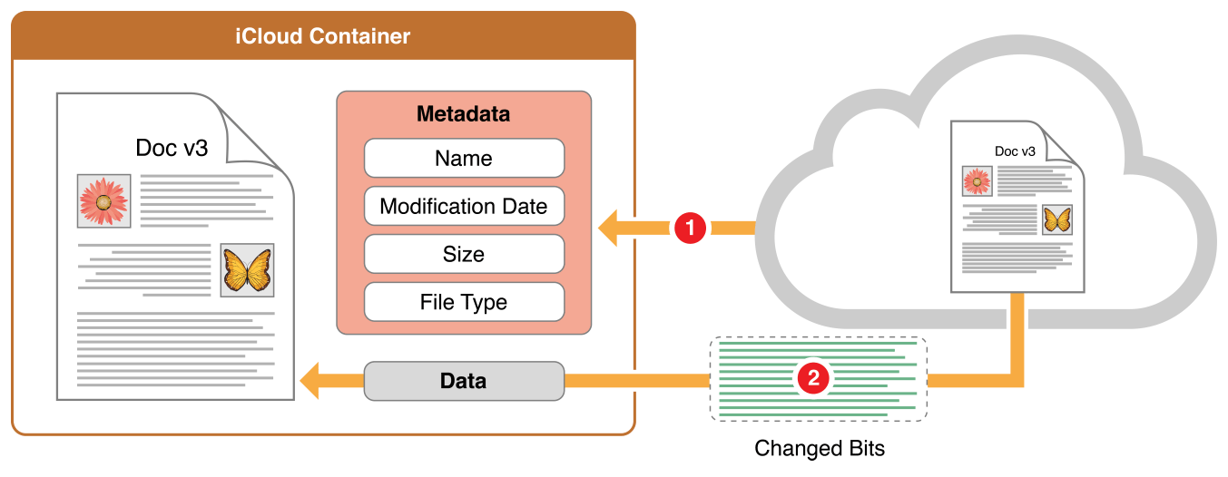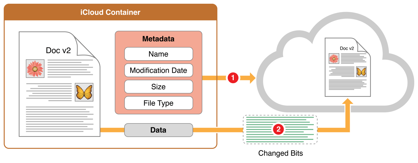If your document data format consists of multiple distinct pieces, use a file package for your document file format. A file package, which you access by way of an NSFileWrapper object, lets you store the elements of a document as individual files and folders that can be read and written separately—while still appearing to the user as a single file. The iCloud upload and download machinery makes use of this factoring of content within a file package; only changed elements are uploaded or downloaded.