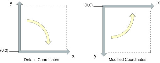 Some technologies set up their graphics contexts using a different default coordinate system than the one used by Quartz. Relative to Quartz, such a coordinate system is a modified coordinate system and must be compensated for when performing some Quartz drawing operations. The most common modified coordinate system places the origin in the upper-left corner of the context and changes the y-axis to point towards the bottom of the page. A few places where you might see this specific coordinate system used are the following: