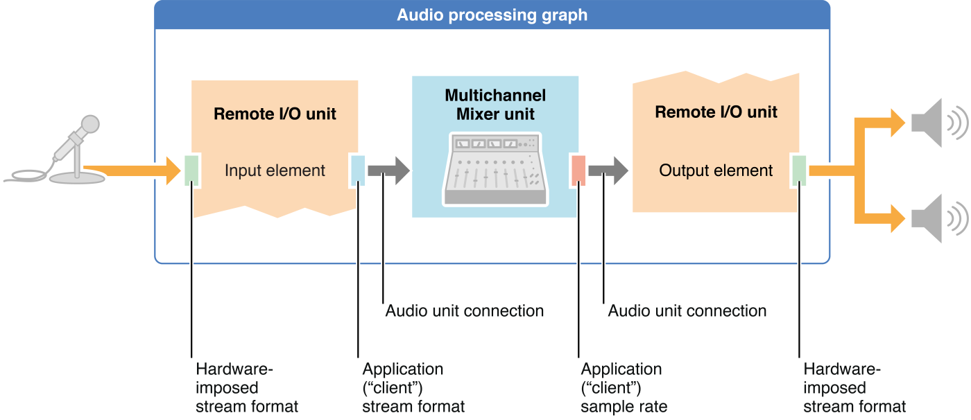 Similarly, the loudspeakers in the figure represent the output audio hardware. The system determines the output hardware’s stream format and imposes it onto the output scope of the Remote I/O unit’s output element.