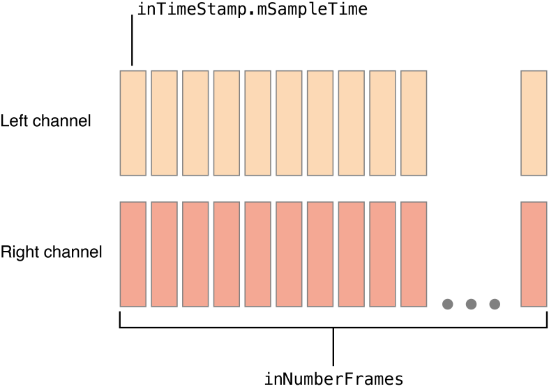 The inTimeStamp parameter represents the time at which the callback was invoked. It contains an AudioTimeStamp structure, whose mSampleTime field is a sample-frame counter. On each invocation of the callback, the value of the mSampleTime field increments by the number in the inNumberFrames parameter. If your app is a sequencer or a drum machine, for example, you can use the mSampleTime value for scheduling sounds.
