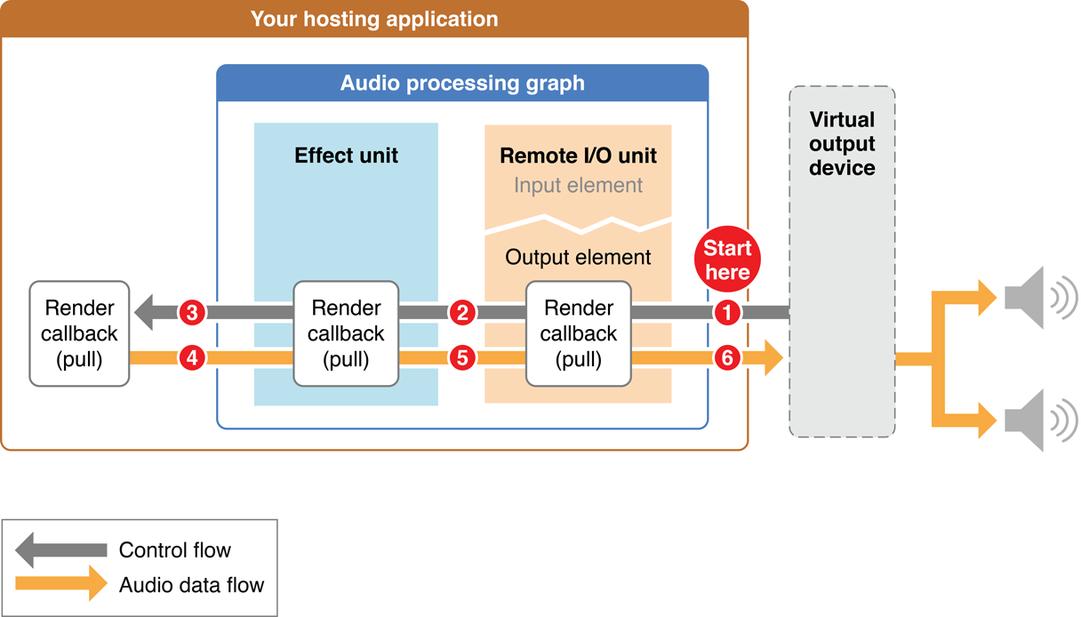 1. After you call the AUGraphStart function, the virtual output device invokes the render callback of the Remote I/O unit’s output element. This invocation asks for one slice of processed audio data frames.