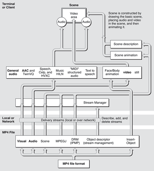 In February 1998, the International Standards Organization (ISO) formally adopted the QuickTime file format as the starting point for the MPEG-4 file format, the latest in a series of standards for transmitting video and audio information. MPEG-4 differs from MPEG-1 and MPEG-2 by adopting a component-based architecture for multimedia, an approach similar to QuickTime’s architecture. Other existing standards have less flexibility and treat multimedia as just an array of picture elements.