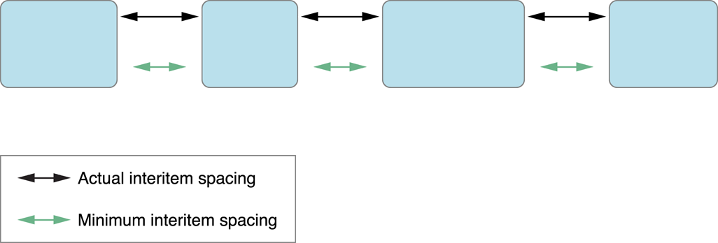 For interline spacing, the flow layout object uses the same technique that it does for inter-item spacing. If all items are the same size, the flow layout is able to respect the minimum line spacing value absolutely and all items in one line appear to be spaced evenly from the items in the next line. If the items are of different sizes, the actual spacing between individual items can vary.