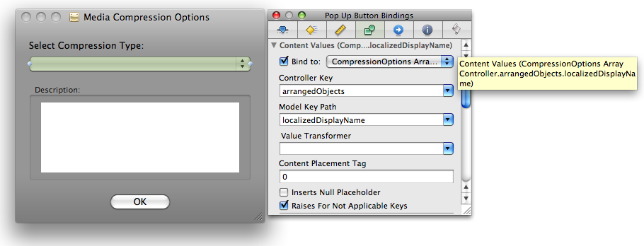 Establishing this binding in Interface Builder is equivalent to programatically sending the localizedDisplayName message each of the managed QTCompressionOptions instances and will populate the pop-up with the returned string values.