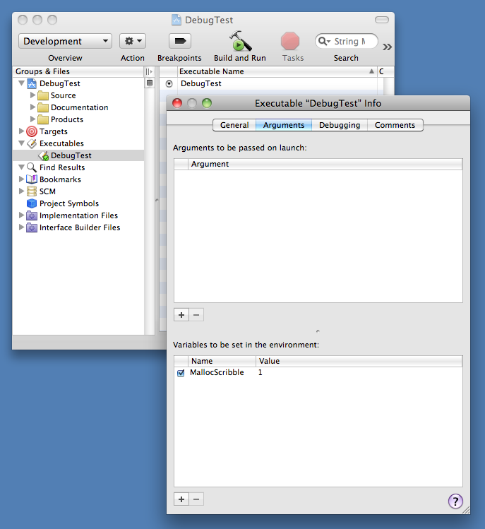 Some debugging facilities are enabled by setting a special preference. You can set such a debugging preference by configuring a command line argument in Xcode. Figure 2 shows how this is done.