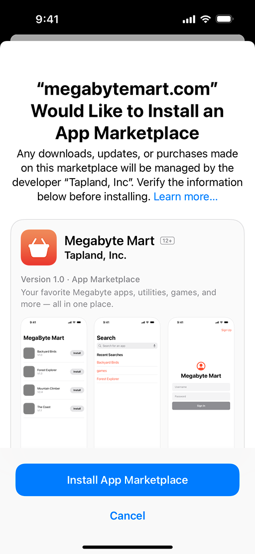 Users can install marketplace apps from a website owned by the marketplace developer after approving the developer in Settings on their iPhone or iPad.